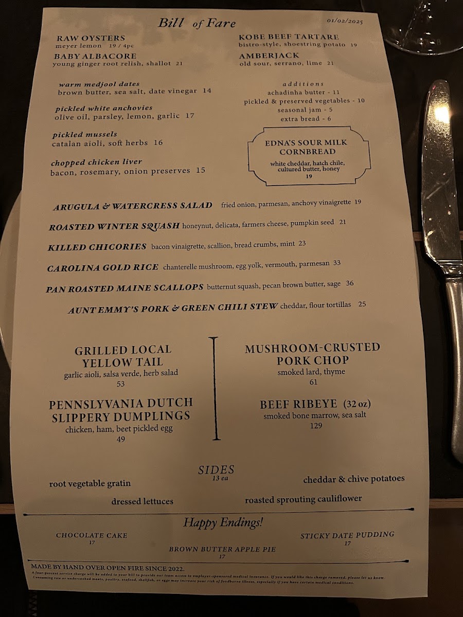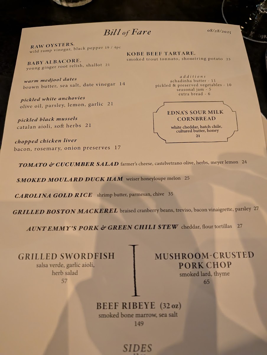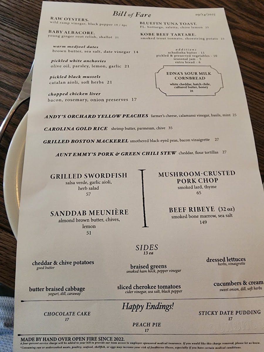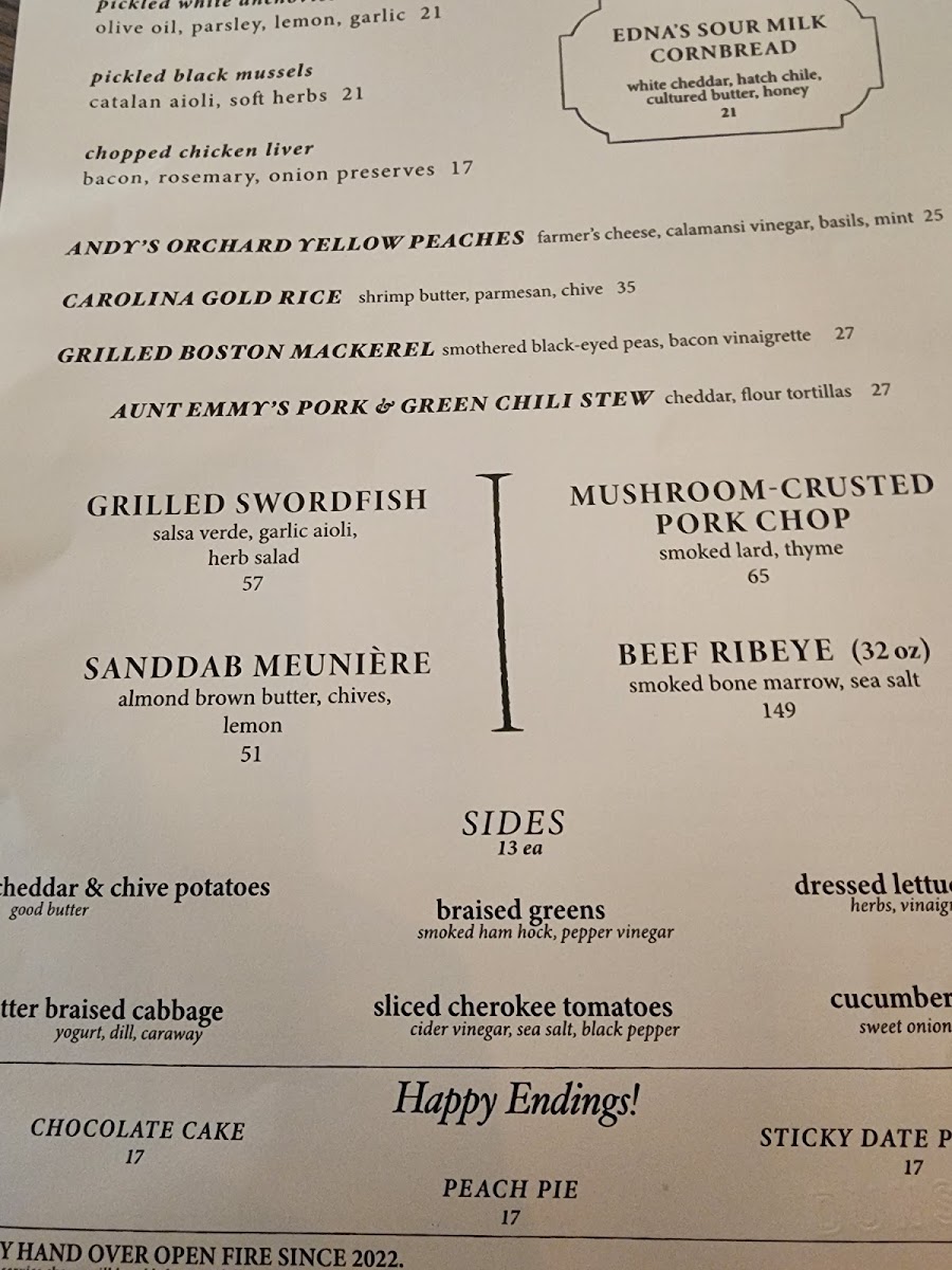 Side dishes complement the mains with selections like Edna's Sour-Milk Cornbread, Cheddar & Chive Potatoes, Dressed Lettuces, Risotto, Caesar Salad, and Braised Cabbage.