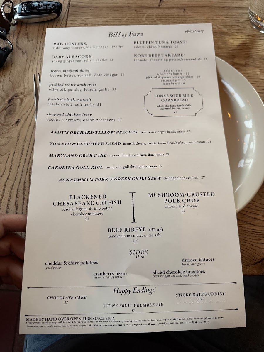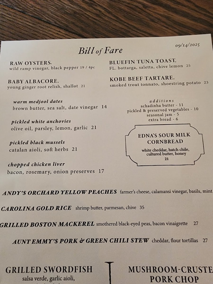 The menu at Dunsmoor features a diverse selection of dishes organized into several key categories, allowing guests to explore a wide range of flavors and preparations. Guests can start with a variety of raw and wood-roasted oysters, including options like Wood-Roasted Oysters à La Bourguignonne and Coal Roasted Oysters. The appetizer section also includes items such as Kobe Beef Tartare, Pickled Mussels, and Warm Medjool Dates.